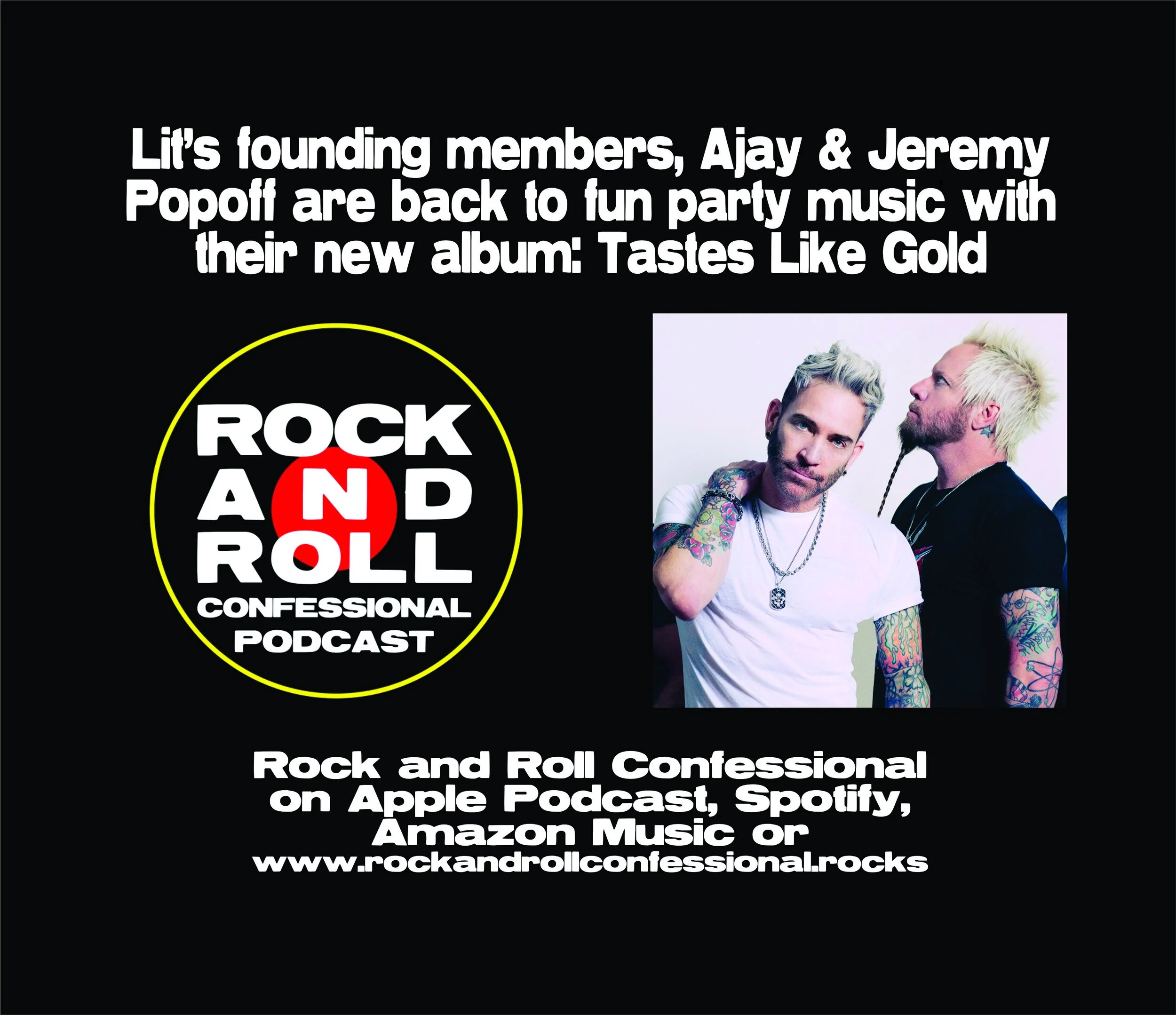 /We’ve got a great new episode with founding members, and brothers Ajay & Jeremy Popoff of Lit. Lit had one of the biggest mega hits in the 90s: My Own Worst Enemy, along with many others. The bands last album was a shift to country, but their latest album: Tastes Like Gold is back to the bands original roots – great party music. Including songs like Yeah Yeah Yeah and Kicked Off The Plane!